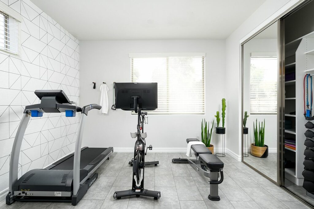 After you have a good measurement on each item, you can decide where they will go and then fill in the remaining space with the smaller, more portable pieces of equipment (dumbbells, resistance bands, etc.). Be sure that the organization of it all flows so that it’s easy to use and won’t clog up too much of your already-limited space.