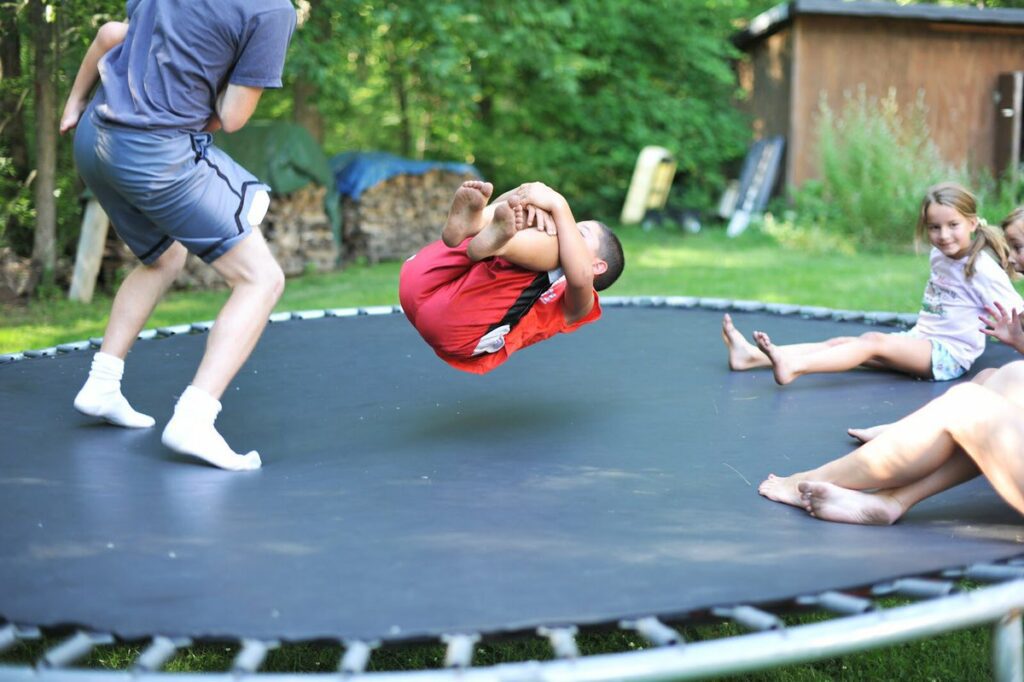 This open-ended trampoline game is all about creativity and silliness. To begin, have each child take turns jumping as high as they can in the centre of the trampoline. The higher the bounce, the more air time they’ll have to create their pose. Please encourage them to make the funniest, most exciting poses they can think of while suspended at the top of their jump. The possibilities for trampoline tricks and poses are endless – they can pull their legs up into cannonball shapes, arch into backbends, split their legs into mid-air splits, or twist into funny arm-flailing contortions. There’s no right or wrong, just creative expression. This game usually has no clear winner since the purpose is to laugh at the crazy moves each kid dreams up. Feel free to snap pictures of their silliest poses to embarrass them later. This can go on for a long time as the kids’ imaginations run wild, and it’s always fun to see what they come up with.